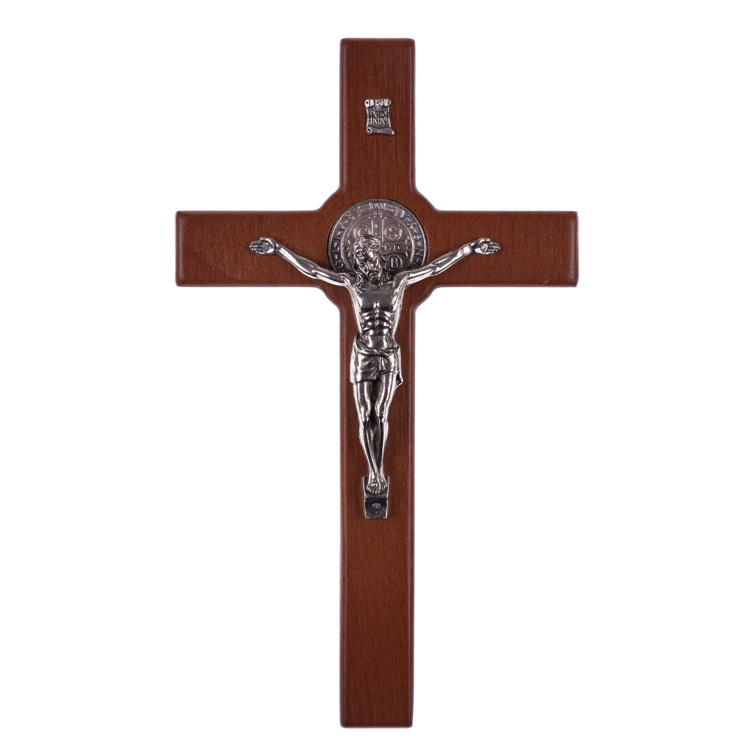 Croix de St Benoît en bois suspendue avec pasque bronze 18x10x1.8cm