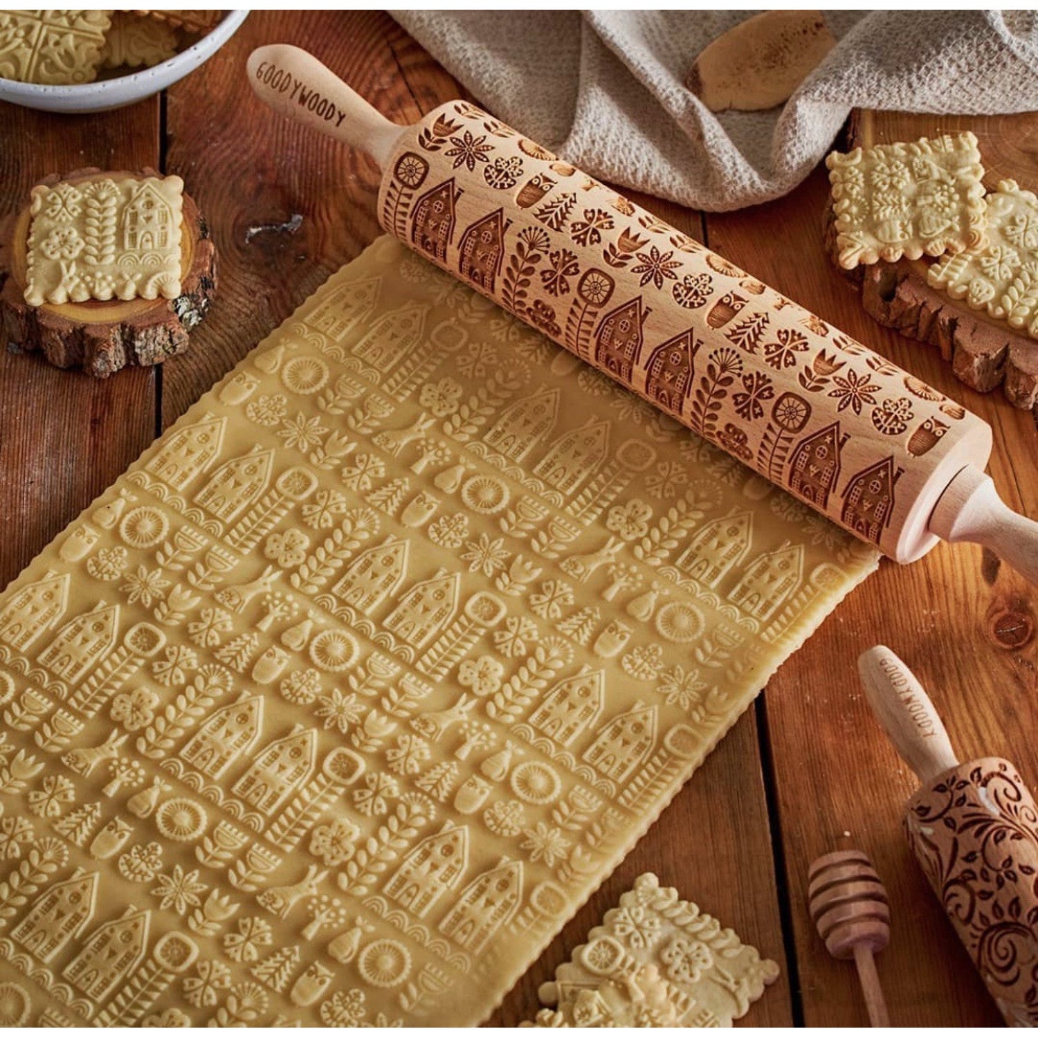 Rouleau à gâteau gravé Goody Woody, 46 cm, bois de hêtre, style scandinave