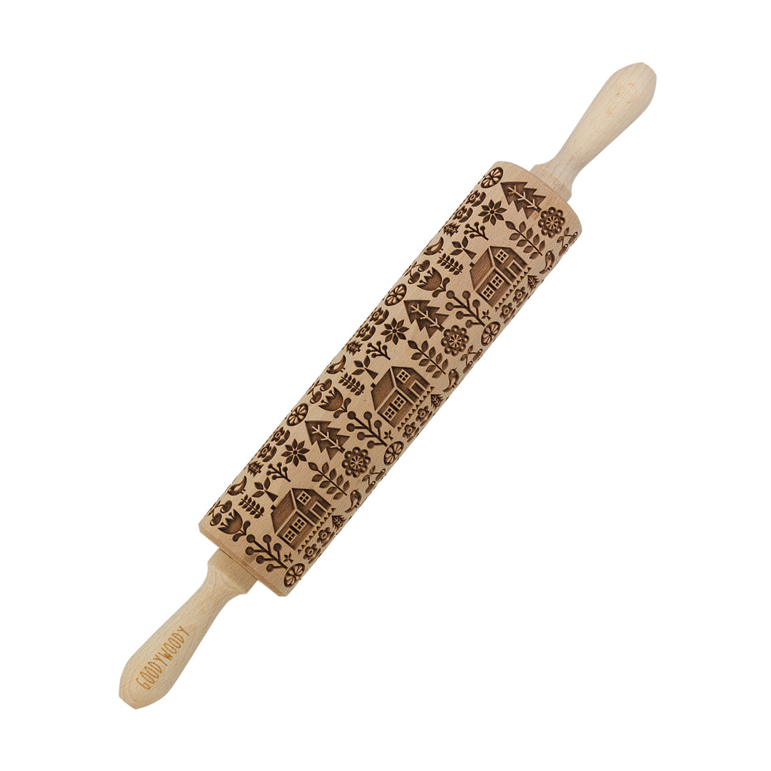 Rouleau à gâteau gravé Goody Woody, 46 cm, bois de hêtre, maison scandinave