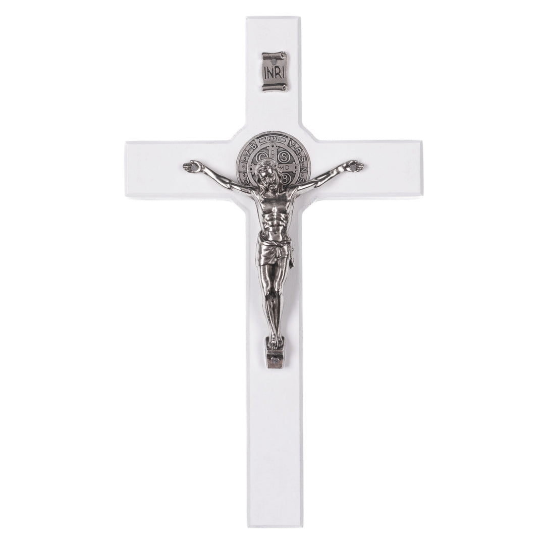 Croix en bois de St Benoît suspendue avec pasque blanc 18x10x1.8cm