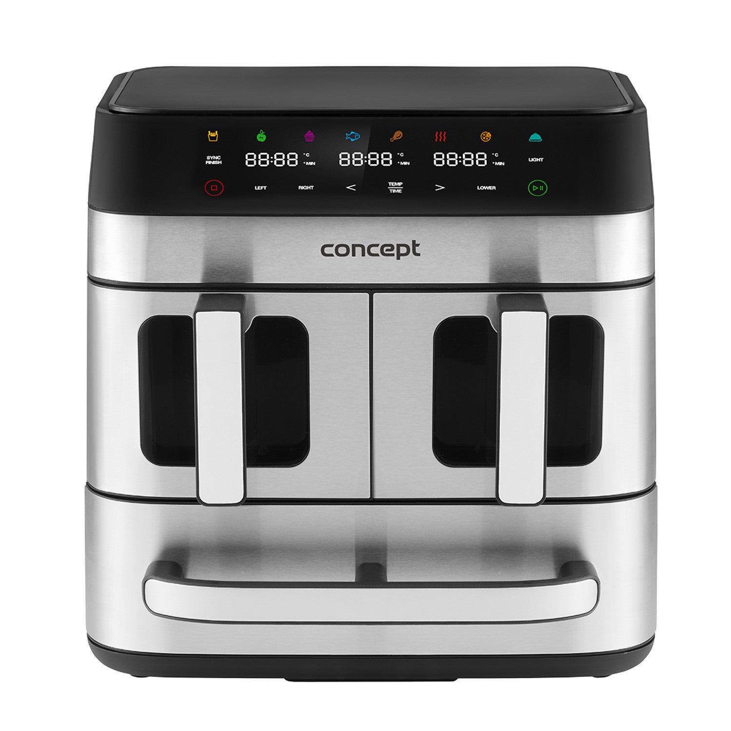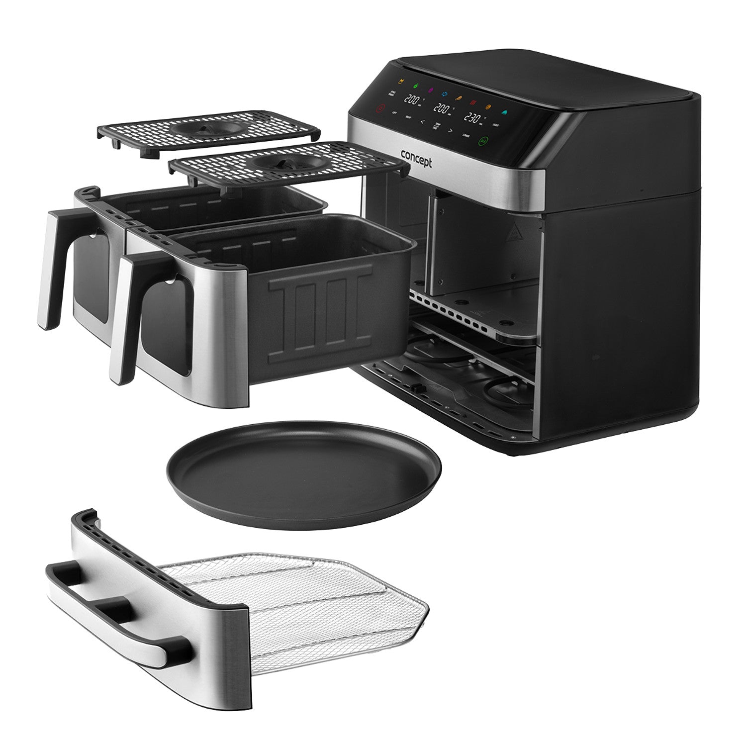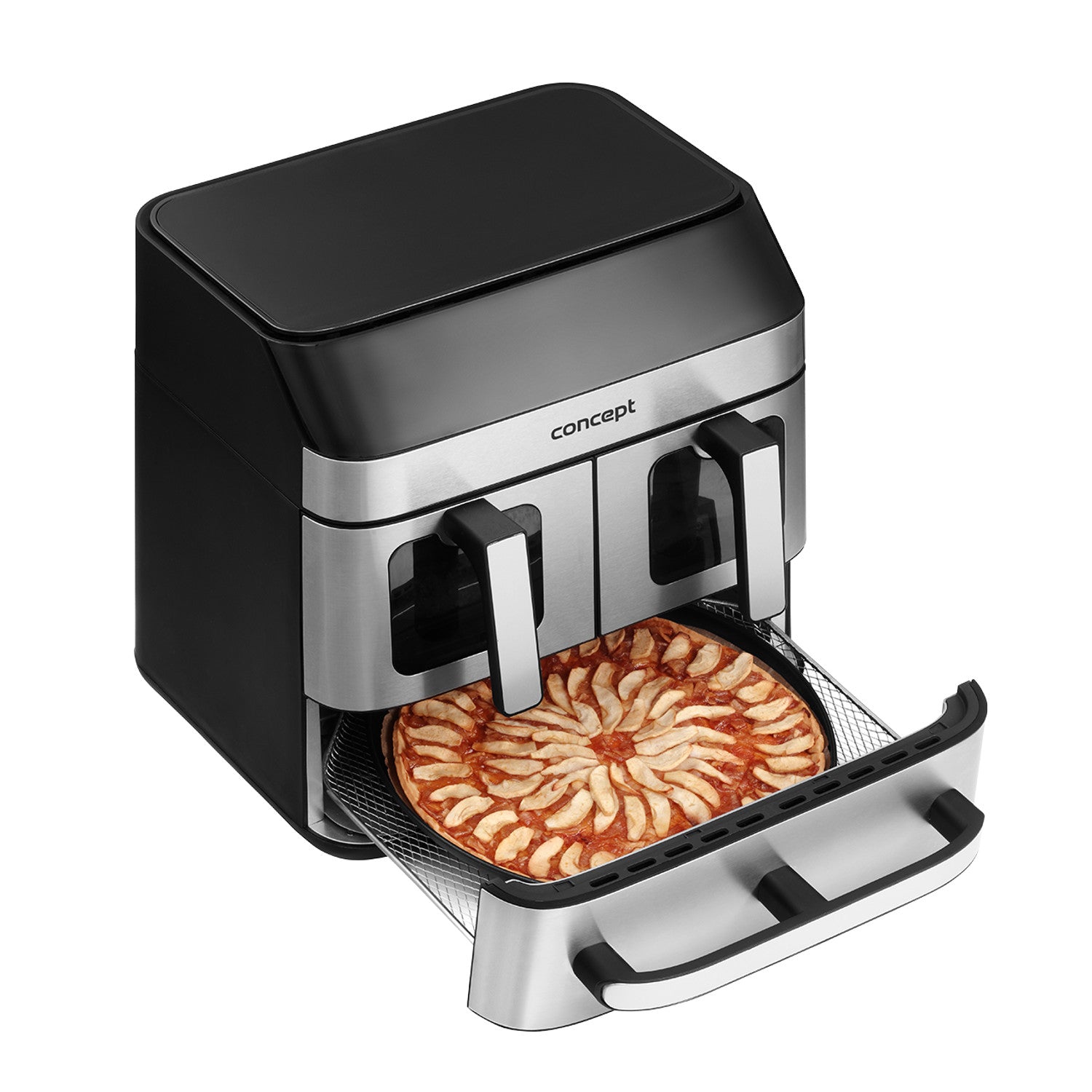 Avec la friteuse sans graisse PIZZA TRIO Concept FR9000 de 18,5 l, dotée de deux paniers indépendants et d'un tiroir à pâtisserie multifonctionnel, vous préparez un menu complet en une seule fois. Pendant que vous préparez un plat principal et un accompagnement dans les paniers de la friteuse, faites cuire un gâteau pour votre café de l'après-midi dans le tiroir multifonctionnel. C'est la nouvelle génération de cuisine - rapide, savoureuse, efficace et sans compromis.