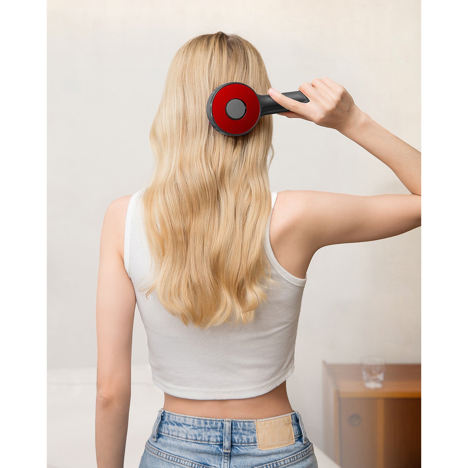 Elle est dotée d'un réservoir intégré dans lequel vous pouvez verser votre revitalisant, lotion ou huile préférés. Des bâtonnets de distribution creux spéciaux, combinés à un mécanisme de massage, distribuent le produit de manière uniforme et précise, directement à la racine des cheveux.