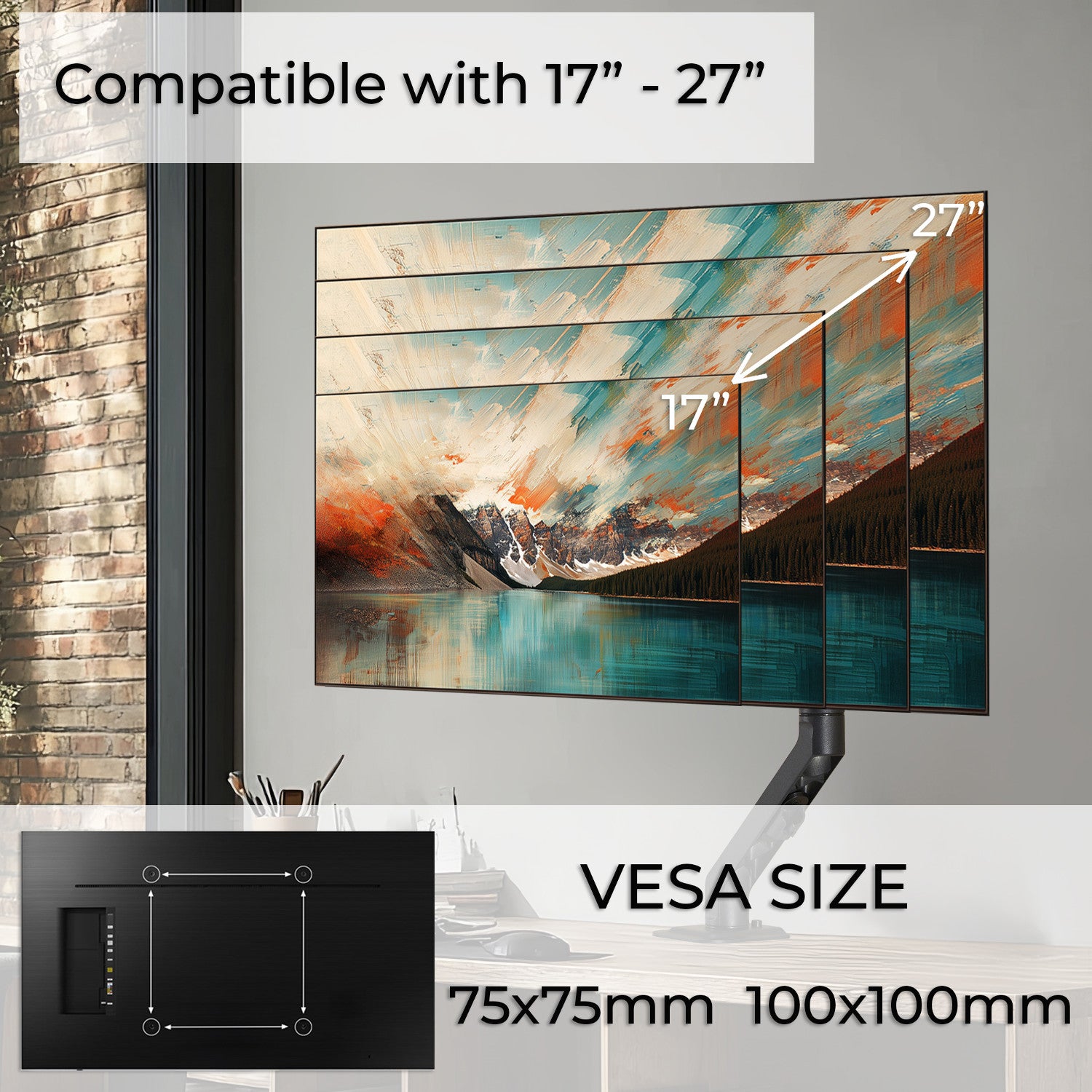 Le support pour écran convient pour les écrans de 17" à 27" avec VESA : 75x75 ou 100x100 et un poids allant jusqu'à 7kg.