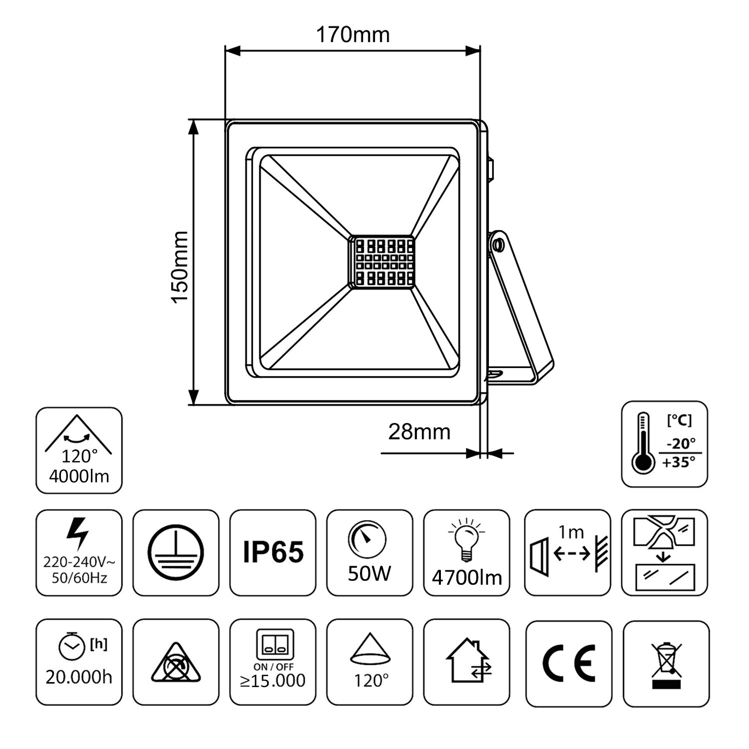 L'indice d'étanchéité IP65 protège l'appareil de l'humidité, ce qui permet d'utiliser le projecteur comme lampe d'extérieur. La poignée réglable permet d'ajuster l'angle d'éclairage.