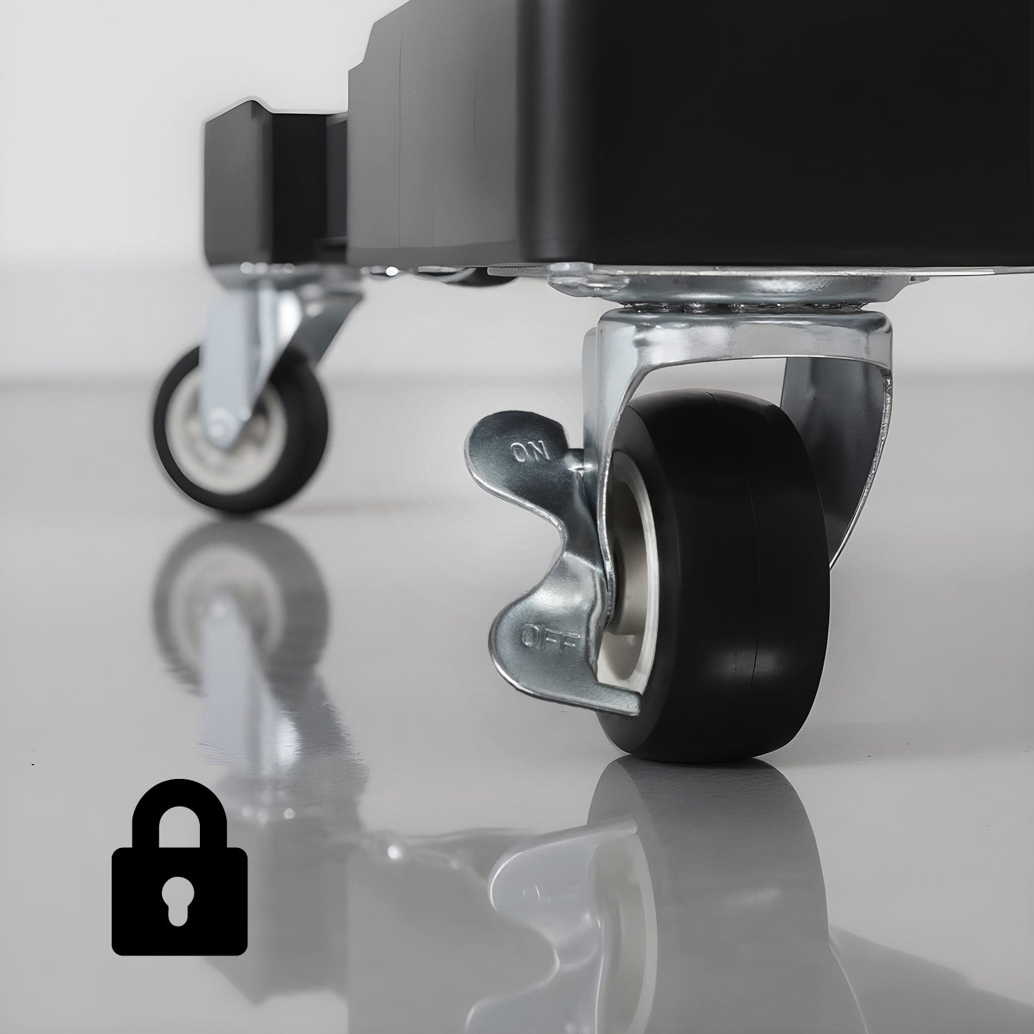 La base est équipée de roulettes robustes qui permettent de déplacer facilement l'appareil à n'importe quel endroit, ce qui est idéal pour le nettoyage ou l'entretien de l'équipement. Deux des roulettes sont équipées d'un mécanisme de blocage, qui garantit la stabilité et empêche le lave-linge de se déplacer accidentellement pendant le fonctionnement. L'utilisateur est ainsi assuré que l'appareil restera en place même lorsque le tambour tourne intensément.