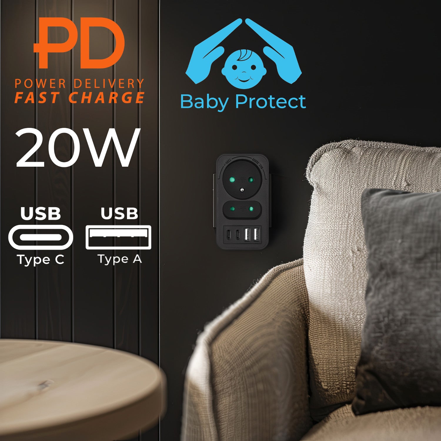 Les deux ports USB de type A intégrés avec jusqu'à 3A (18 W max.) sont parfaits pour charger des accessoires tels que des écouteurs sans fil, des powerbanks, des haut-parleurs Bluetooth ou des brassards de sport. Les deux ports USB de type C avec la technologie Power Delivery (max. 20 W) assurent une charge rapide et stable des appareils modernes (smartphones, tablettes, consoles portables et autres appareils prenant en charge la norme Power Delivery). Grâce à cette combinaison, il est possible d'alimenter simultanément plusieurs appareils ayant des besoins en énergie différents, sans avoir besoin de chargeurs supplémentaires.