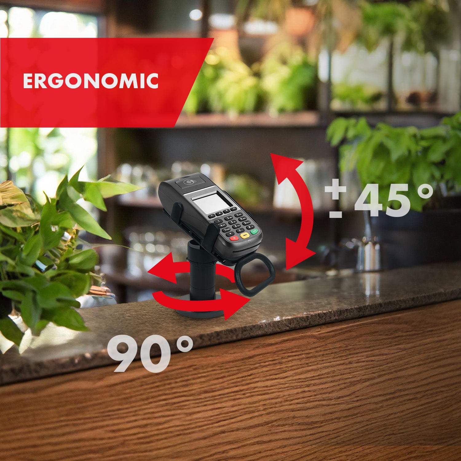 La conception permet de faire pivoter le terminal de 90° pour faciliter l'interaction avec le client.
