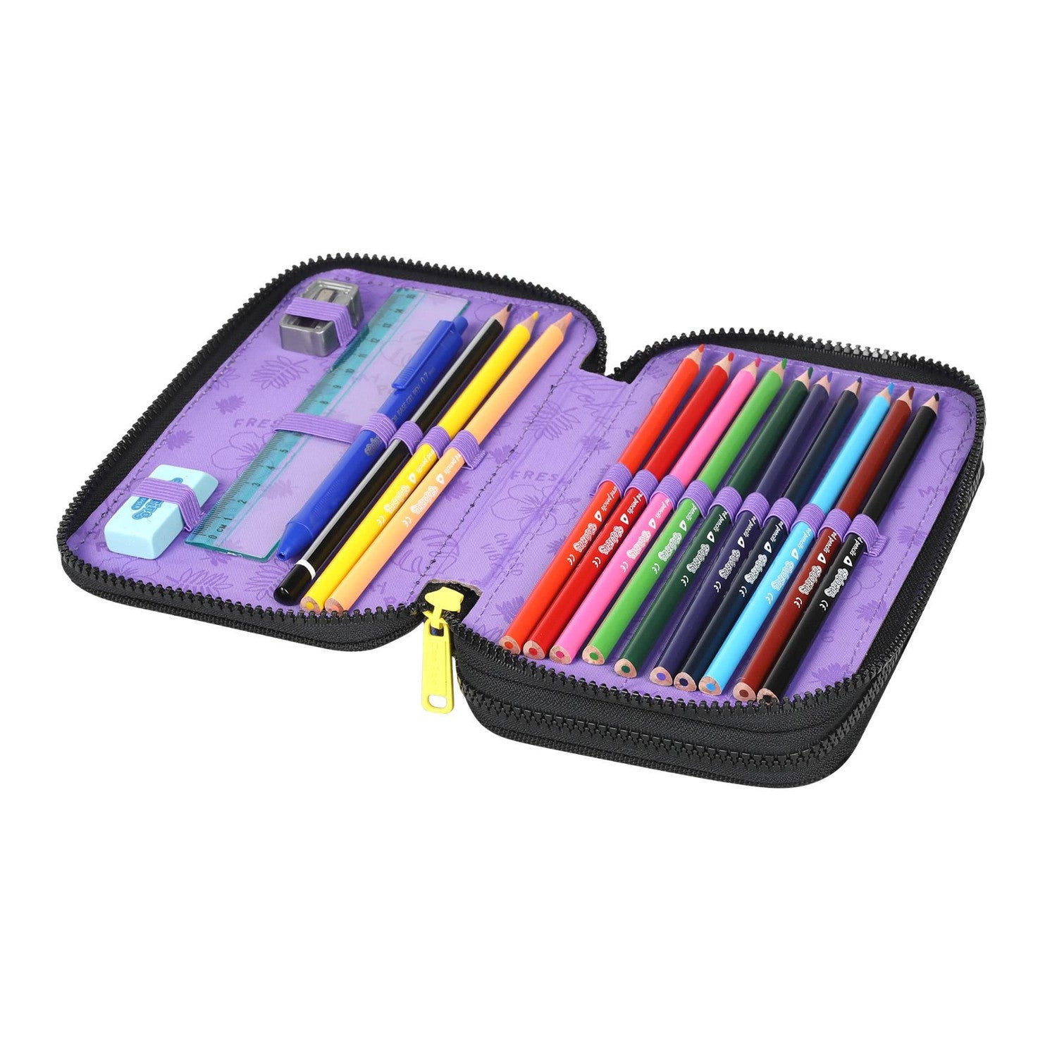 Deux compartiments - elle est très spacieuse, ce qui permet d'y ranger beaucoup de choses. Le premier compartiment contient 12 crayons de couleur, un crayon à papier, un stylo, une règle jusqu'à 15 cm, un taille-crayon et une gomme, et le second compartiment contient 18 marqueurs de couleur. Tout est donc à portée de main et vous n'avez pas à vous soucier du contenu de votre matériel scolaire.