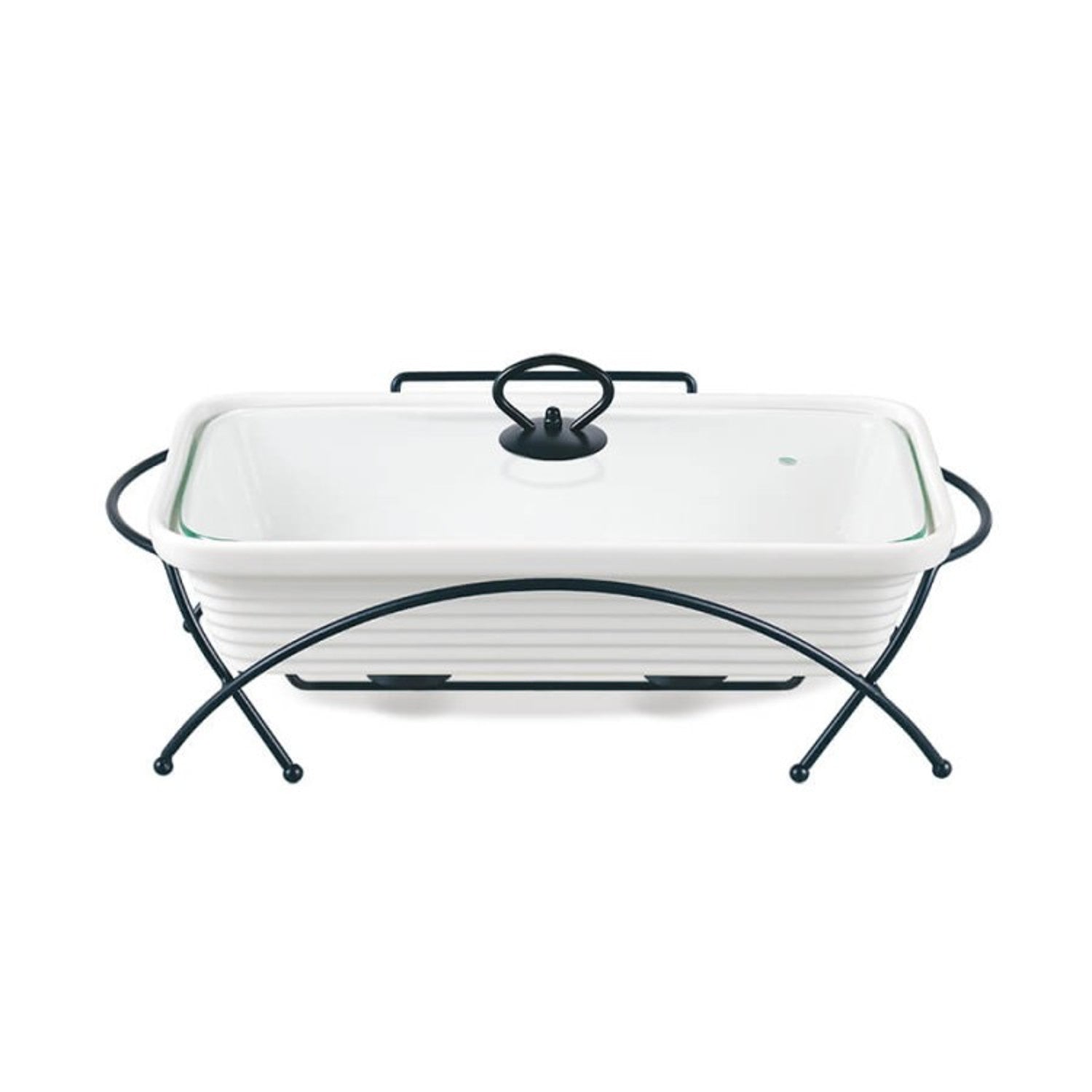 Il est équipé d'un support pour deux bougies chauffe-plat afin d'assurer un chauffage homogène et de créer une ambiance chaleureuse lors du service des plats. Parfait pour les dîners en famille, les fêtes ou les dîners romantiques, ce réchaud deviendra un élément essentiel de votre art de la table.