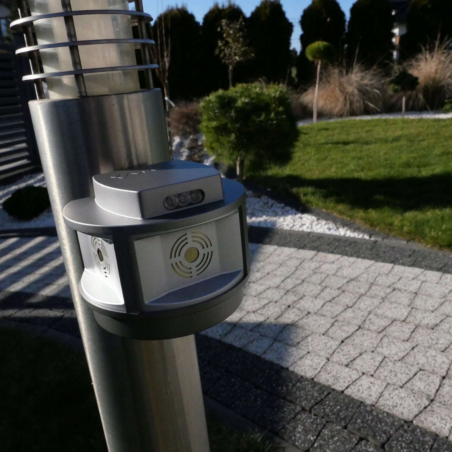 En plaçant les haut-parleurs perpendiculairement les uns aux autres dans trois directions, on obtient un angle d'action pouvant aller jusqu'à 270 degrés. Le plus grand avantage de l'appareil est qu'il est sans fil et qu'il a une longue durée de vie. La version sans fil de l'appareil, dotée d'une batterie interne de grande capacité (4Ah Li-ion), est capable de fonctionner pendant plus de 200 jours avec une seule charge en mode son et ultrasons (chargeur inclus) et jusqu'à 100 jours avec le mode LED activé en plus.