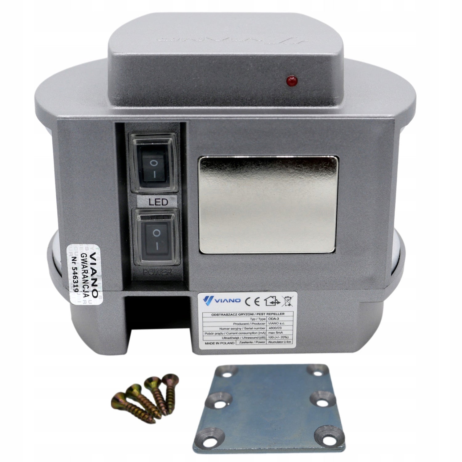 - Version sans fil avec batterie interne rechargeable et chargeur - fonctionnement de plus de 200 jours sur une seule charge en mode d'émission sonore et ultrasonique, jusqu'à 100 jours avec le mode LED activé en plus.