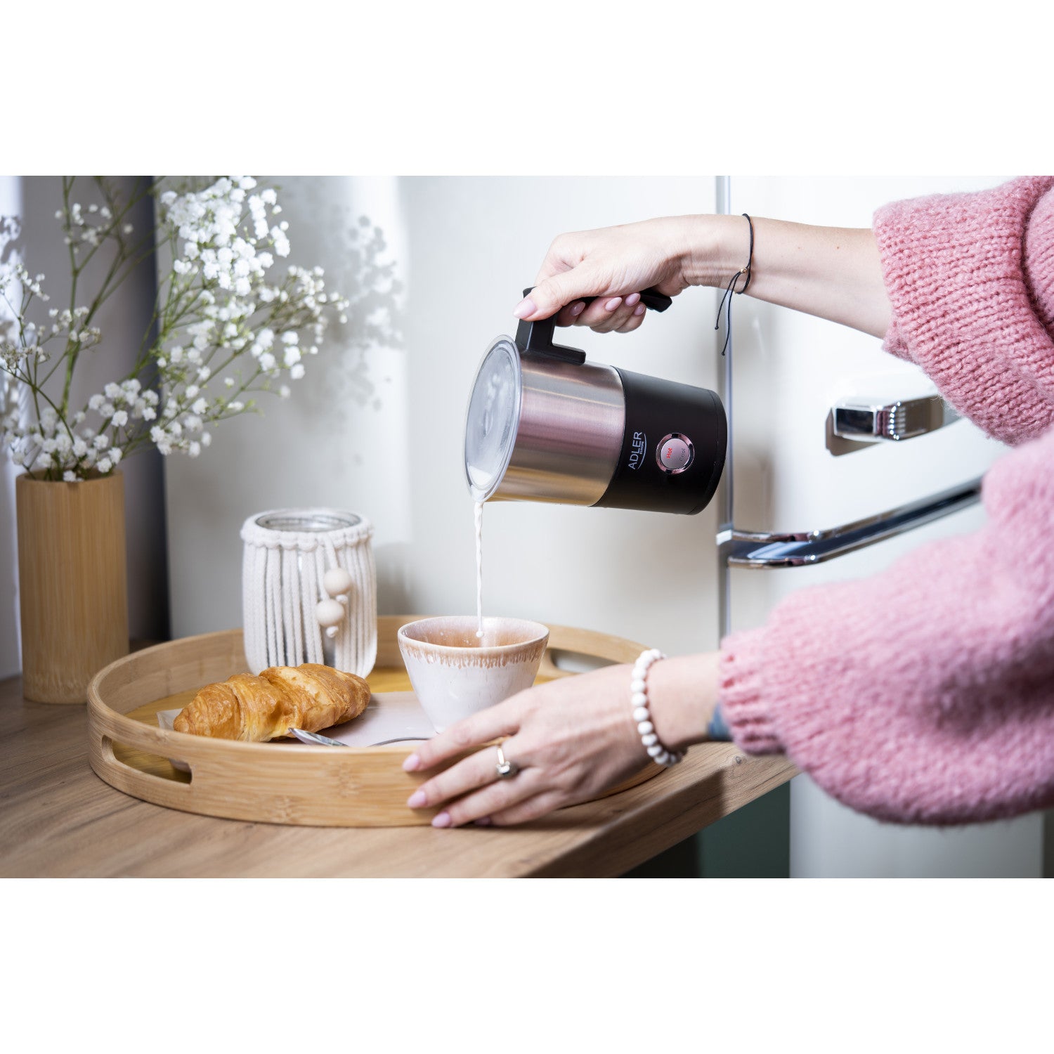 Un autre avantage de l'appareil est qu'il permet même de préparer une mousse à partir d'une boisson végétale, qui est devenue une alternative intéressante et plus saine au lait de vache traditionnel. L'agitateur magnétique permet même de faire mousser des boissons à faible teneur en matières grasses. Le couvercle transparent avec joint vous permet d'observer le processus de moussage du lait et d'éteindre l'appareil lorsque la quantité de mousse souhaitée est obtenue. La machine elle-même permet de préparer jusqu'à 300 ml de lait chaud et 120 ml de mousse de lait, ce qui permet de préparer en même temps plusieurs cafés pour les invités ou les membres de la famille.